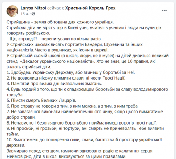 «Стрыйщина - земля обетованная для каждого украинца. Стрыйские дети не верят, что в Киеве ученики, учителя с учениками и люди на улицах говорят на русском. "Что, правда?!" - переспрашивали по несколько раз. В Стрыйских школах висят портреты Бандеры, Шухевича и других националистов. Часто в полотенцах, как иконы в церкви. В Стрыйской седьмой школе (в школе, люди, не в музее) на детей смотрит большой стенд "Декалог украинского националиста". Замираю перед стендом, подавляя удивленно-радостный звон сердца. Невероятно, дети в школе воспитываются по этим правилам», - экзальтированно сообщила Ницой.