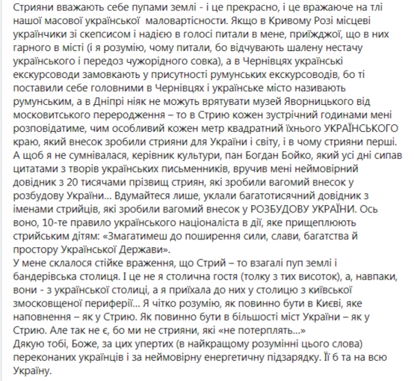 «Стрияны считают себя пупами земли - и это прекрасно, и это потрясающе на фоне нашей массовой украинской неполноценности», - восхитилась Ницой.