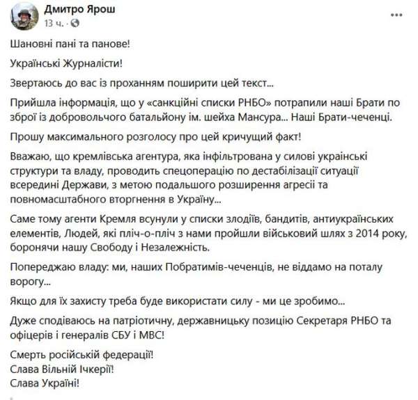 «Пришла информация, что в "санкционные списки СНБО" попали наши братья по оружию из добровольческого батальона им. шейха Мансура... Наши братья-чеченцы», — написал радикал.
