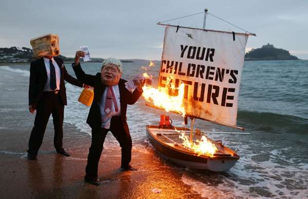 На фоне происходящего особенно выделяется организация Extinction Rebellion, члены которой разыграли театральную сценку "Борис Джонсон в кровати с нефтяным олигархом" прямо напротив отеля делегаций. Они устроили перфоманс с мертвыми русалками и, наконец, организовали шествие в красных сатанинских (как их окрестили местные) балахонах.