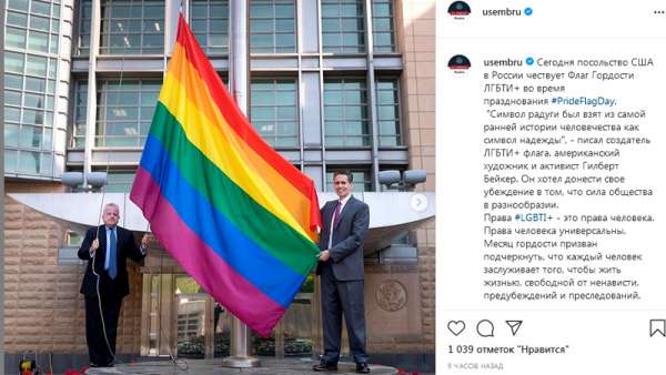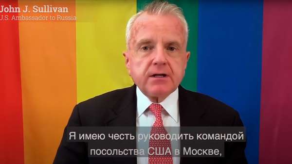 Как только посол США в России Джон Салливан вернулся в Москву из Вашингтона, на здании дипломатического представительства рядом с государственным флагом США вывесили и знаменитый радужный флаг ЛГБТ. Это сразу вызвало кучу шуток в Сети, что, мол, "радужка" свидетельствует о появлении главы посольства. Тем более что мистер Салливан лично принял участие в церемонии поднятия флага.