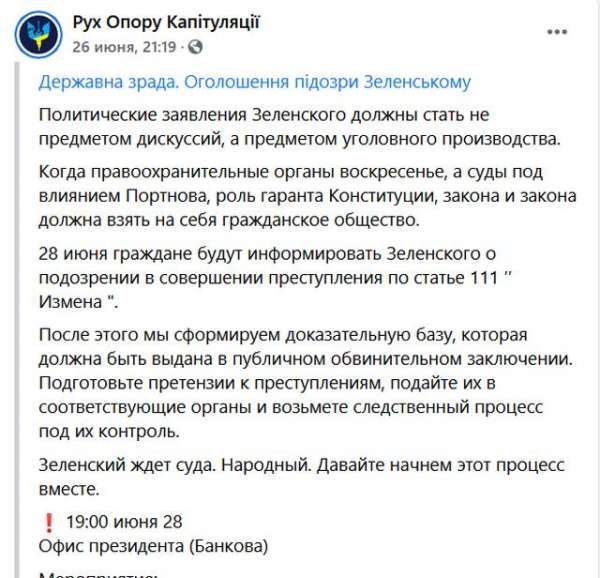 Активисты «Движения сопротивления капитуляции» собираются сегодня, 28 июня, на День Конституции устроить митинг под стенами Офиса президента. Анонс митинга размещён в Facebook.