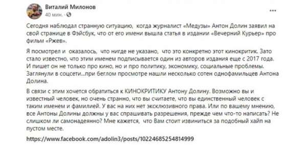 «Я посмотрел и оказалось, что нигде не указано, что это конкретно этот кинокритик. Зато стало известно, что этим именем подписывается один из авторов издания еще с 2017 года. И пишет он не только про кино, но и про политику, экономику, социальные проблемы. Заглянули в соцсети...при беглом просмотре нашли несколько сотен однофамильцев Антона Долина», - заявил Милонов.
