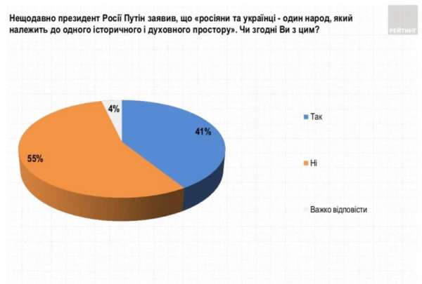 Украинская социологическая группа «Рейтинг» после публикации статьи президента РФ Владимира Путина об историческом единстве русских и украинцев провела соцопрос, в котором жителей страны спросили: «Считают ли они себя и русских одним народом, принадлежащим единому историческому и духовному пространству».