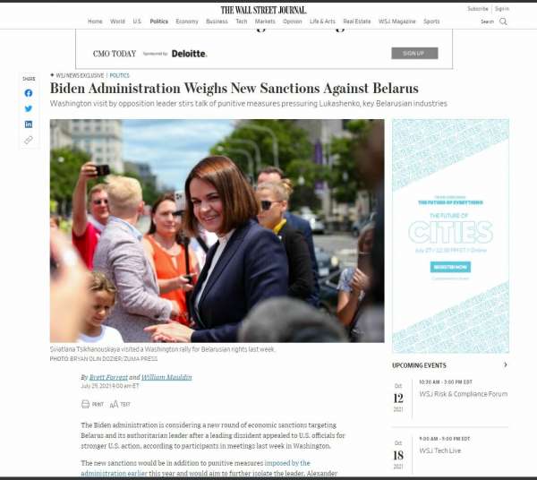 Еще одним результатом продолжающегося визита стало обсуждение новых санкций против Беларуси. Как сообщило американское издание The Wall Street Journal, администрация США после встречи с Тихановской с советником Байдена по нацбезопасности Джейком Салливаном и госсекретарем Энтони Блинкеном стала рассматривать возможность введения новых экономических ограничений против Беларуси и главы государства Александра Лукашенко.