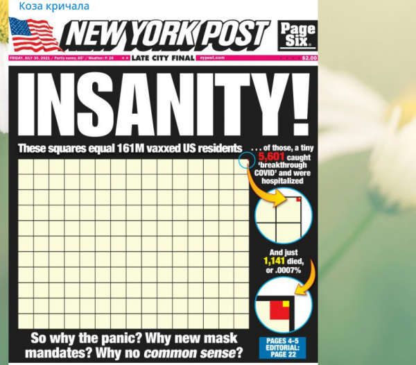 Издатели New York Post поместили на обложке свежего номера необычный призыв к вакцинации. С помощью кричащего заголовка "Безумие" и эффектной графики авторы хотели показать читателям, насколько безопасна прививка от коронавируса.