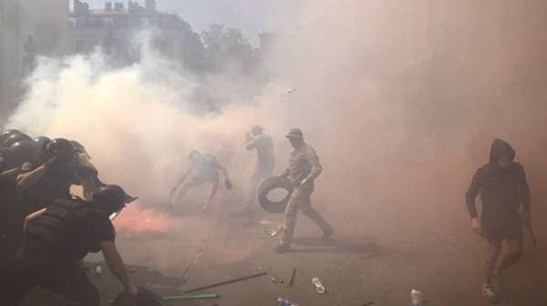 При подходе к Офису президента Украины вспыхнул конфликт — участники марша отказались проходить досмотр и попытались прорваться через цепи силовиков (как утверждает присутствовавший на месте журналист «Страны» приказ на это дал вождь «Нацкорпуса» Андрей Билецкий, находившийся рядом на автомашине со звукоусилением). Началась толкотня. Полиция сразу «залила» оппонентов слезоточивым газом (досталось при этом и журналистам), в свою очередь, националисты зажгли дымовые шашки и начали бросать в силовиков с близкого расстояния покрышки (не зажженные). На какой-то момент все происходившее приобрело инфернальный характер.