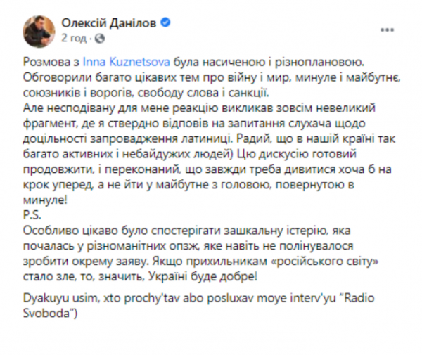 «Dyakuyu usim, xto prochyʼtav abo posluxav moye intervʼyu „Radio Svoboda‟», — написал Данилов.