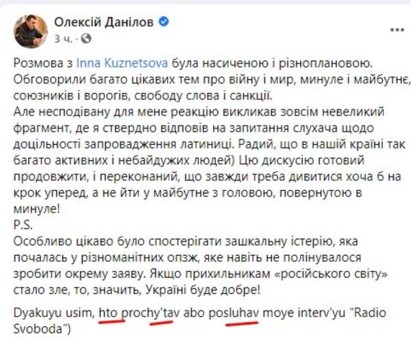 Чиновник выложил своё скандальное интервью для «Радио Свобода», разместил подпись к нему на украинском языке и одно предложение написал латиницей, а не родной для украинцев кириллицей.