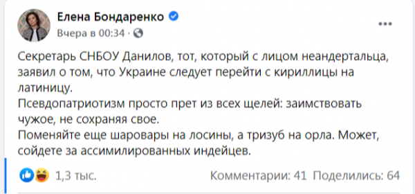 «Секретарь СНБОУ Данилов, тот, который с лицом неандертальца, заявил о том, что Украине следует перейти с кириллицы на латиницу. Псевдопатриотизм просто прёт из всех щелей: заимствовать чужое, не сохраняя своё. Поменяйте ещё шаровары на лосины, а тризуб на орла. Может, сойдёте за ассимилированных индейцев», — написала политик в соцсети.