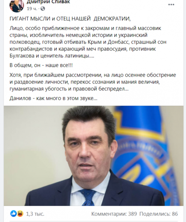 «Лицо, особо приближённое к закромам и главный массовик страны, изобличитель немецкой истории и украинский полководец, готовый отбивать Крым и Донбасс, страшный сон контрабандистов и карающий меч правосудия, противник Булгакова и ценитель латиницы... В общем, он — наше всё!!! Хотя, при ближайшем рассмотрении, на лицо осеннее обострение и раздвоение личности, перекос сознания и мания величия, гуманитарная убогость и правовой беспредел... Данилов — как много в этом звуке...», — едко заметил он в Facebook.