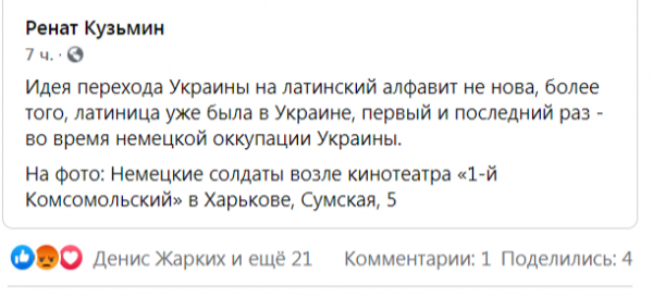 «Более того, латиница уже была на Украине, первый и последний раз — во время немецкой оккупации Украины. На фото: Немецкие солдаты возле кинотеатра „1-й Комсомольский‟ в Харькове, Сумская, 5», — написал он в соцсети, тем самым лишний раз подчёркивая сущность заправляющей в стране власти.