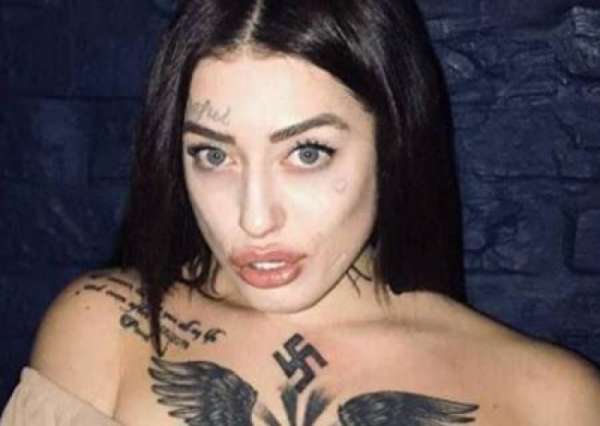 Интернет-пользователи нашли героиню видео. Как оказалось, она является приверженицей нацистских взглядов. На груди у неё набита свастика и крылья римского орла.