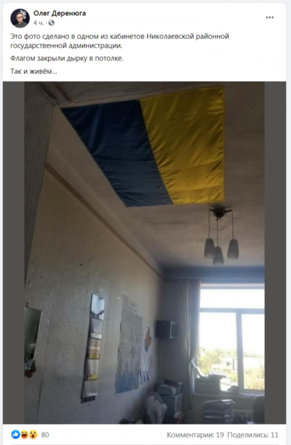 А в Николаеве чиновники флаг сжигать не стали, а закрыли им дыру в потолке в одном из кабинетов райадминистрации.