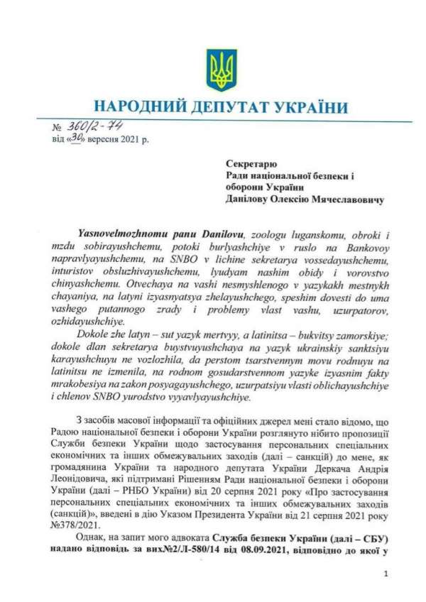 Внефракционный народный депутат Андрей Деркач в письменном виде обратился к секретарю Совета национальной безопасности и обороны (СНБО) Украины Алексею Данилову.