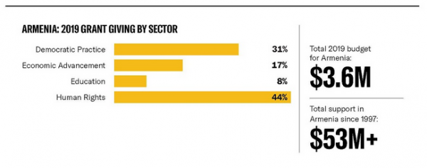 С момента образования в далеком 1997 году ФОО-Армения Сорос потратил на армянскую «демократию» более 53 млн долларов, профинансировав деятельность более 200 НПО. Сразу после поражения от Азербайджана ФОО-Армения активно включился в «гуманитарную» борьбу за Карабах: более 10 грантов в рамках «гуманитарной помощи мирным жителям Арцаха» на общую сумму более четверти миллиона долларов только за последний квартал 2020 года.