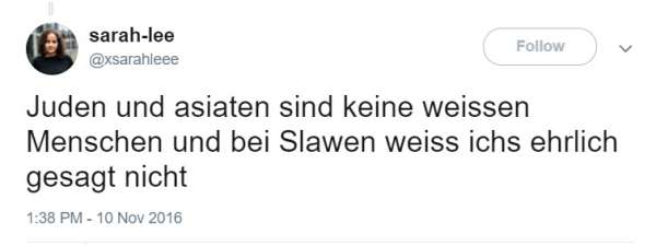 В 2015 году сторонница расовой теории Сарочка опубликовала твит с со словами: «Азиаты и евреи не белые люди, насчет славят точно не знаю». Сейчас мамзелька пытается оправдаться, заявляя, что нечего к ней придираться. Мол, повзрослела, осознала и больше не поддерживаю нацистов.