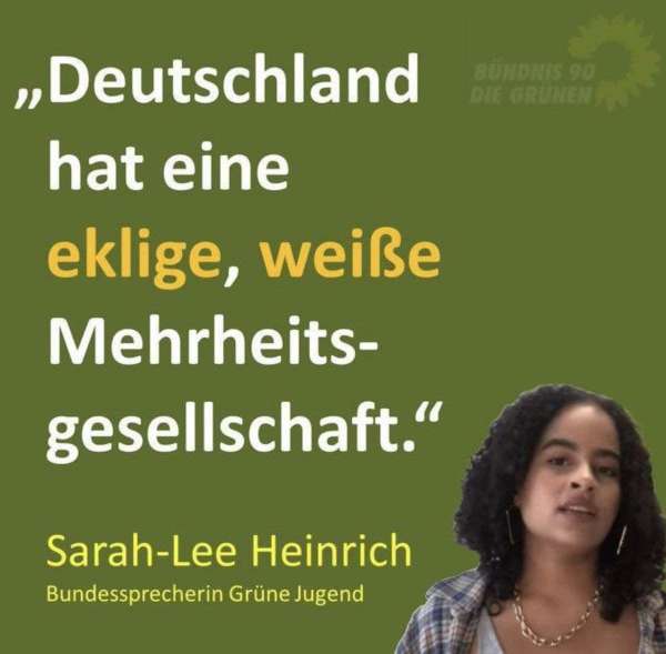 Федеральным представителем партии стала темнокожая девушка по имени Сара-Ли Хайнрих. Весьма колоритная особа, которой белые люди, как выяснилось, по жизни мешают и вообще она сомневается, что их можно причислять к людям. Вероятно, считает всех, у кого светлая кожа, кем-то вроде обезьянок-альбиносов. Получается, «Зеленые» не только продвигают леволиберальную повестку, но и не осуждают черный расизм.