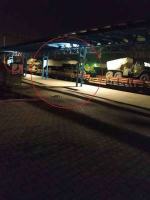 На размещенном выше снимке можно увидеть момент прохождения эшелона, на платформах которого размещены РСЗО БМ-21 «Град» и несколько тягачей укрытых брезентом. Как утверждают специалисты, это машины 9Т238, которые предназначены для транспортировки двух ракет для ОТРК «Точка» или же «Точка-У». Сами же пусковые для маскировки, как обычно, прикрыты брезентом.