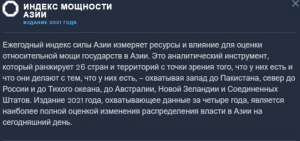 Горжусь своей страной! И причин предостаточно. Одна из них – вхождение России в пятерку лидеров рейтинга азиатской мощи The Lowy Institute. Рейтинг публикуется с 2018 года.