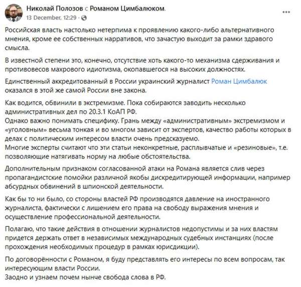 «Роман Цимбалюк — единственный украинский журналист, аккредитованный в России. Его обвиняют в экстремизме и хотят возбудить несколько административных дел по 20.3.1 КоАП РФ (разжигание ненависти или вражды)», — возмутилась в своем Telegram-канале уполномоченная Верховной Рады по правам человека Людмила Денисова.