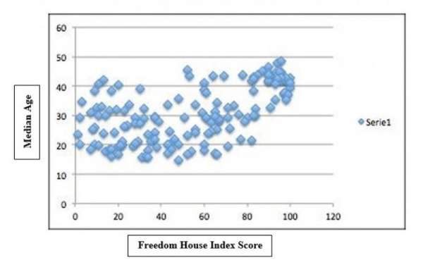 Как видно из графика, ни одна крупная страна не может быть одновременно молодой и свободной. Демократии сгруппированы в правом верхнем углу, представляя самые сильные гражданские и политические права в мире, а также его старейшее население. За последнее десятилетие этот процесс ускорился и в будущем с учётом демографических тенденций будет лишь углубляться. Это не означает, что политическая свобода приводит к старению населения или, что старые общества более благоприятны для демократии.