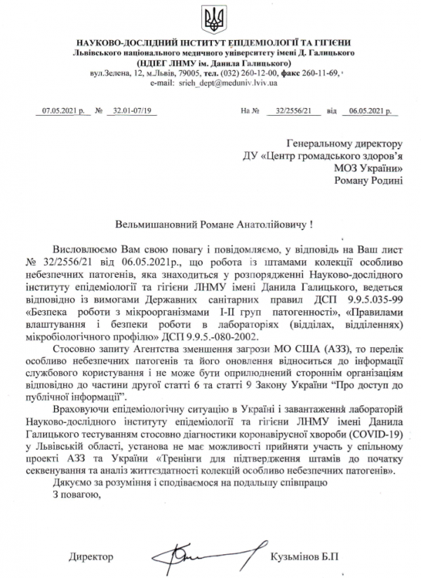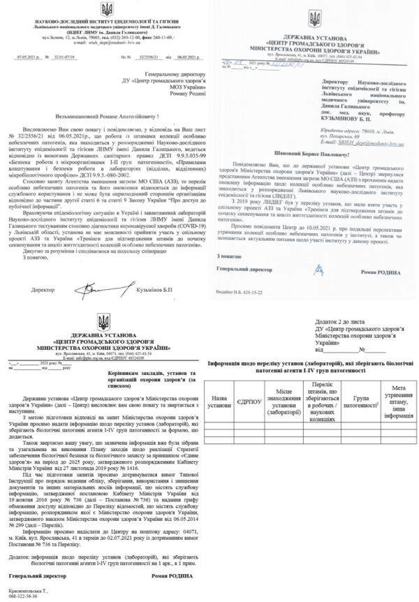 Тем не менее, телеграмм канал Грантоед.by опубликовал документы Министерства здравоохранения Украины и института, занимающегося микробиологическими разработками. По приведенным материалам видно, что ГУ «Центр общественного здоровья Министерства здравоохранения Украины» в интересах «Агентства по уменьшению военной угрозы» МО США (DTRA) запрашивает сведения о работах с микроорганизмами 1 и 2-й степени патогенности у Львовского НИИ эпидемиологии и гигиены.