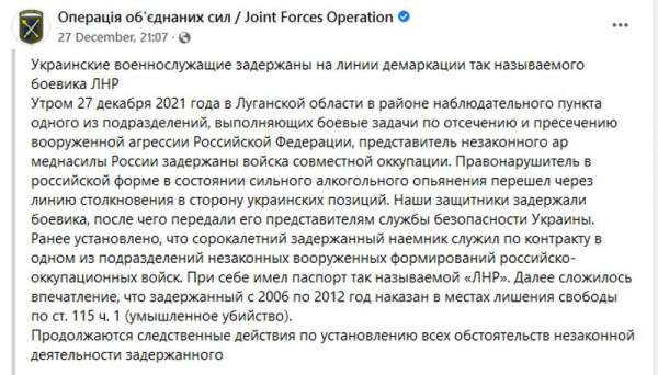 27 декабря пресс-служба командования силовой операции Вооружённых сил Украины (ВСУ) в Донбассе сообщила, что украинские военные задержали военнослужащего ЛНР. Утверждается, что он якобы в ночь на вторник «в состоянии сильного алкогольного опьянения перешёл через линию соприкосновения в сторону украинских позиций в Луганской области, после чего был задержан и передан представителям Службы безопасности Украины».