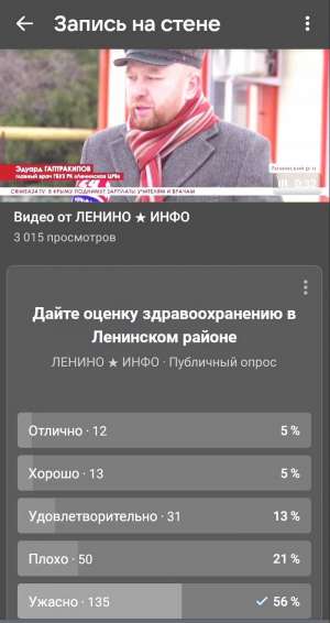 Как показали результаты публичного опроса сайта «Ленино-инфо», 77 процентов респондентов дали негативную оценку достижениям главврача Гаптракипова и его руководителям из республиканского минздрава.