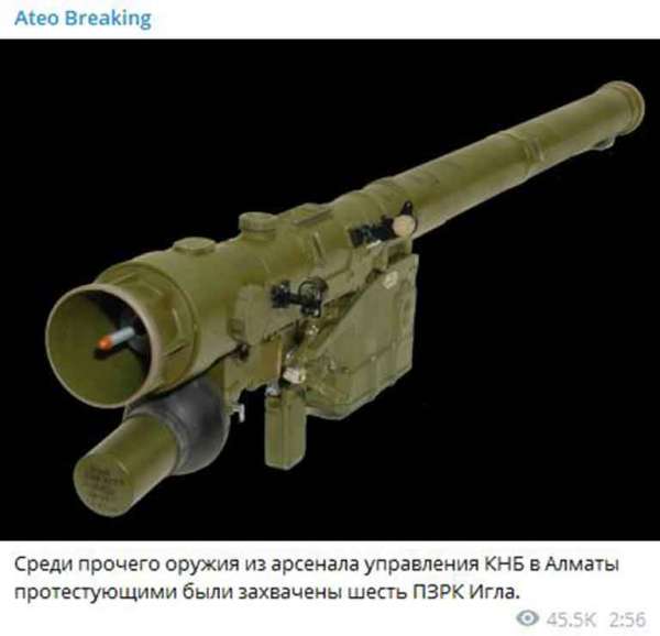 «Среди прочего оружия из арсенала управления КНБ в Алматы протестующими были захвачены шесть ПЗРК «Игла», — говорится в сообщении «Телеграм»-канала «ATEO Breaking».