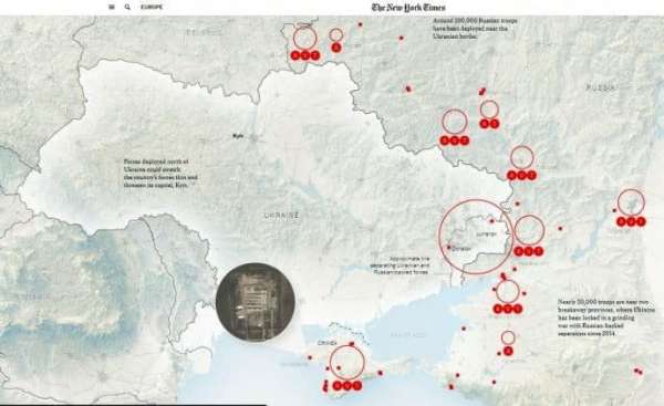 В это сложно поверить, но американское издание The New York Times опубликовало новую карту с возможной дислокацией российских войск на границе с Украиной для гипотетического вторжения.
