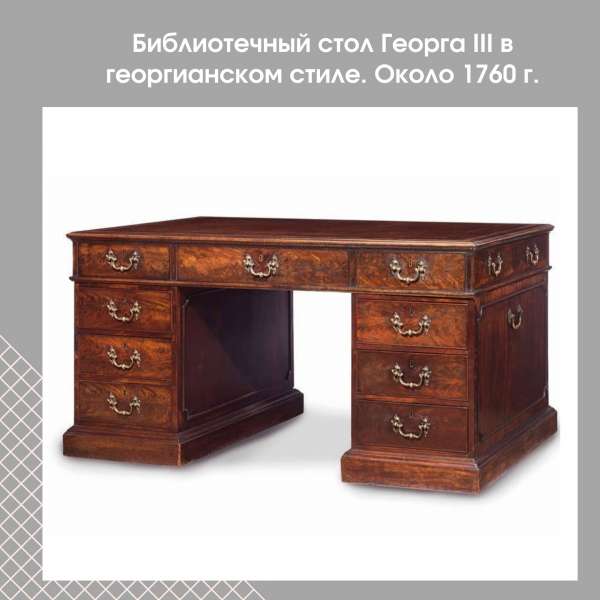 Георгианский стиль доминировал в британском декоре на протяжении 18 века во время правления королей Георга I, II и III. Этот стиль сильно отличался от рококо того времени, так как характеризовался объемными и элегантными конструкциями из красного дерева, прочного и массивного дерева с более "мужским" и царственным видом. Томас Чиппендейл - один из самых известных британских дизайнеров того периода.