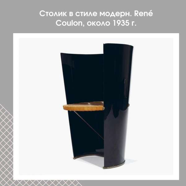 В модернизме появились простые геометрические формы, отсутствие декора, гладкие поверхности и принцип помещения функции объекта в центр, форма и функция считались взаимосвязанными. Эта мебель часто изготавливается из трубчатой стали и гнутого дерева с сильным уклоном в черный цвет.