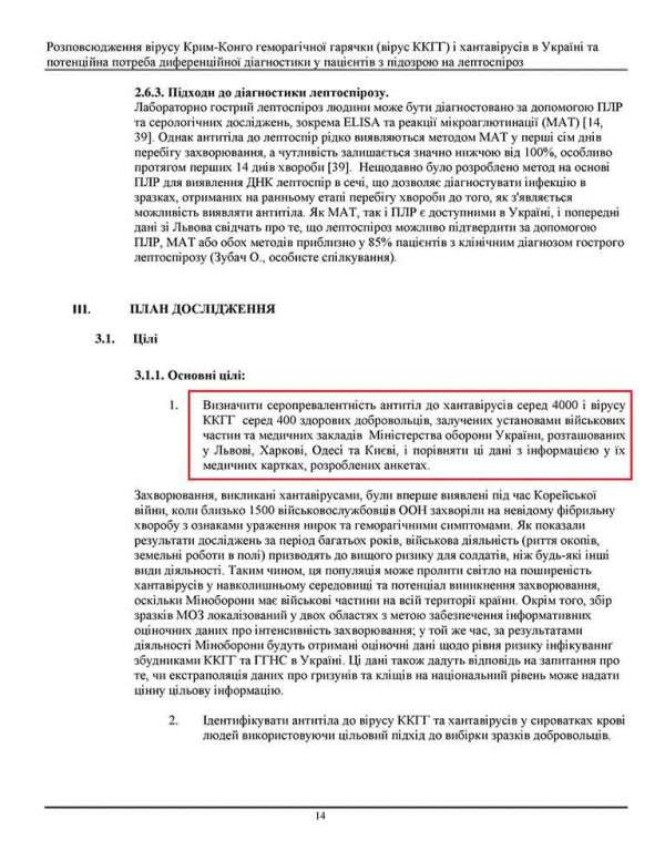 В соответствии с описанием, образцы крови были взяты у 4400 здоровых военнослужащих во Львове, Харькове, Одессе и Киеве. 4000 из этих образцов были проверены на наличие антител к хантавирусам, а 400 из них – на наличие антител к вирусу Конго-крымской геморрагической лихорадки (ККГЛ). Результаты анализа крови участникам исследования не предоставлялись.