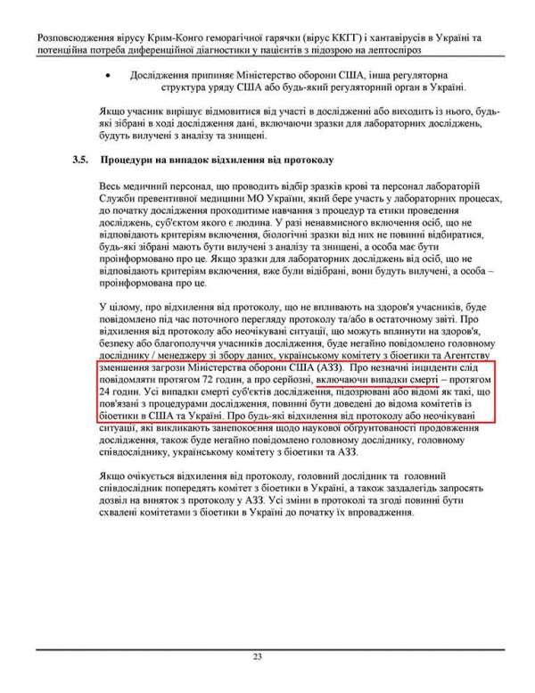 «О серьезных происшествиях, в том числе со смертельным исходом, следует сообщать в течение 24 часов. Все случаи смерти субъектов исследования, которые подозреваются или связаны с исследовательскими процедурами, должны быть доведены до сведения комитетов по биоэтике в США и Украине», — написано в проекте УП-8.