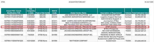 Согласно информации, полученной из реестра федеральных контрактов США, по состоянию на 30 июля 2020 года, DTRA выделило 80 миллионов долларов США на биологические исследования в Украине. Программой занимается американская компания Black & Veatch Special Projects Corp.