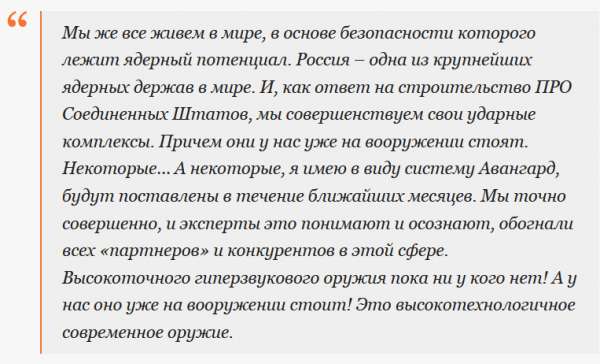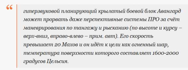 Так не заставляйте нас его применять (это я уже от себя)! Для тех, кто не знает или забыл, я напомню что такое есть «Авангард». Это еще одна опция новой нашей межконтинентальной баллистической ракеты тяжелого класса «Сармат», которая пришла на смену знаменитой МБР «Воевода», наводившей такой ужас на наших «друзей», что получила по классификации НАТО индекс СС-18 «Сатана». Какое название они придумают «Сармату», я уже даже не знаю, но учитывая то, что она будет оснащена в своей боевой части аэростратосферным комплексом «Авангард», способным двигаться в плотных слоях атмосферы на гиперзвуковых скоростях, превышающих скорость звука в 20 раз, что делает его недоступным для вражеских систем ПРО, то скорее всего это будет «Сатана-невидимка».