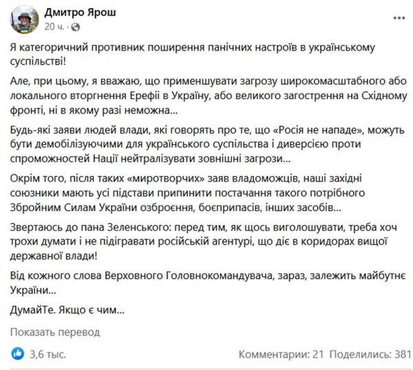 «Любые заявления властей, которые говорят о том, что «Россия не нападет», могут быть демобилизирующими для украинского общества и диверсией против возможности нации нейтрализовать внешние угрозы… Кроме того, после таких "миротворческих" заявлений властей, наши западные союзники имеют все основания прекратить поставки столь нужного Вооруженным силам Украины вооружения, боеприпасов, других средств», — высказал он своё мнение.