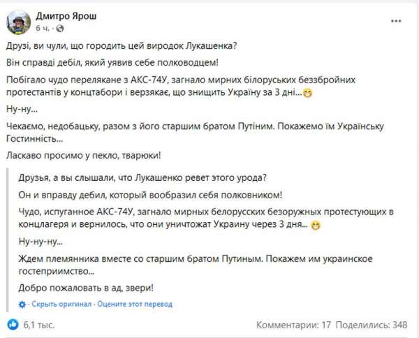 Заявление Лукашенко оскорбило украинских националистов. В соцсетях они пишут гневные посты и как командующий Украинской добровольческой армией Дмитрий Ярош обещают Лукашенко «украинское гостеприимство и ад».