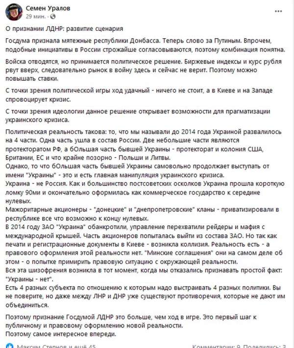 С точки зрения политической игры ход удачный — ничего не стоит, а в Киеве и на Западе спровоцирует кризис. С точки зрения идеологии данное решение открывает возможности для прагматизации украинского кризиса», — написал на своей странице в Facebook политолог, шеф-редактор «Сонар 2050» Семён Уралов.