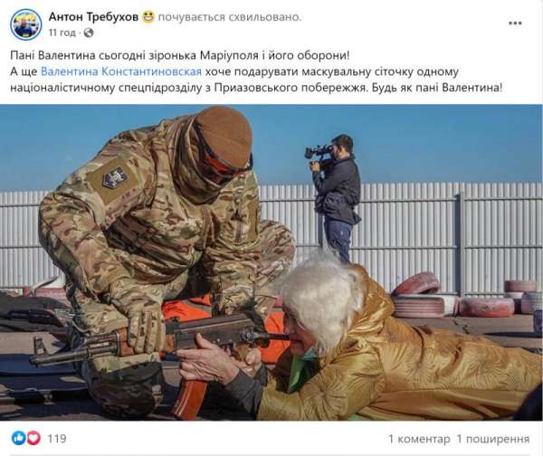 «Госпожа Валентина сегодня звездочка Мариуполя и его обороны! А еще Валентина Константиновская хочет подарить маскировочную сеточку одному националистическому спецподразделению с Приазовского побережья. Будь как госпожа Валентина!» – написал спикер Национального корпуса, опубликовав совместное фото бабули и ее персонального «тренера». На его одежде также четко видны нашивки со свастикой.