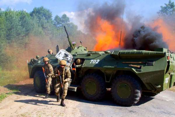Горит БТР, идёт бой со спецгруппой противника у границы с РФ