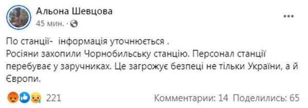 «Россияне захватили Чернобыльскую станцию. Персонал станции находится в заложниках. Это угрожает безопасности не только Украины, но и Европы», - написала она в фейсбуке.