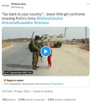 Этот пост набрал в Twitter более 2 тысяч лайков и 700 с копейками ретвитов. Если бы интернет-пользователи не поленились проверить видео, то они узнали бы, что ему уже много лет. В реальности эту девочку засняли в Палестине в 2012 году. Да и посмотрите на кадры: сейчас на дворе только конец зимы, а тут показали лето, девочка легко одета.
