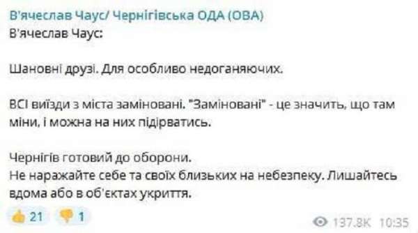 Сомнительные слухи приходят и о семье главы Черниговской областной администрации Вячеслава Чауса. Его семья также покинула окруженный город еще в первые дни российской операции, но пока еще находится во Львове. Сам же Чаус в то же время генерирует «замечательные» заявления о том, что город жителям покидать не стоит, ибо все пути из него заминированы.