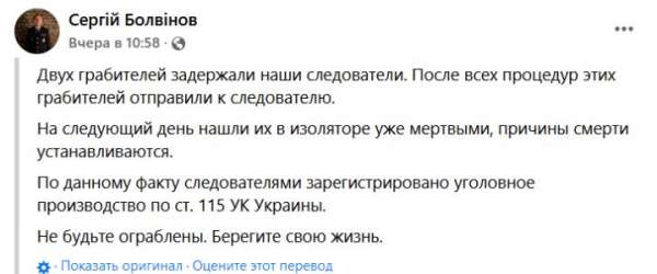 «Нашими следователями были задержаны два мародера. После всех юридических процедур эти мародеры были направлены в следственный изолятор. На следующий день мы нашли их в изоляторе уже мертвыми, причины смерти устанавливаются. По данному факту следователями зарегистрировано уголовное производство по ст. 115 Уголовного кодекса Украины. Не мародерствуйте. Берегите свою жизнь», — написал на своей странице в Facebook глава следственного управления областной полиции Сергей Болвинов.