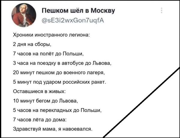 Порадовали наёмники, слетевшиеся со всего мира на лёгкое сафари, подразумевающее безнаказанную охоту за беззащитными русскими: ужас в глазах, слёзы от увиденного, сопли от прочувствованного – нет более прекрасного и красноречивого свидетельства мощи армии, с которой этим псам войны никогда и нигде до сих пор не приходилось сталкиваться.