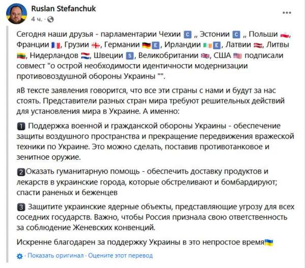 «Сегодня Чехия, Эстония, Польша, Франция, Грузия, Германия, Ирландия, Латвия, Литва, Нидерланды, Швеция, Великобритания и США подписали совместное заявление "О неотложной необходимости модернизации системы ПВО Украины". Искренне благодарен за поддержку Украины в это непростое время», — написал председатель украинского парламента.