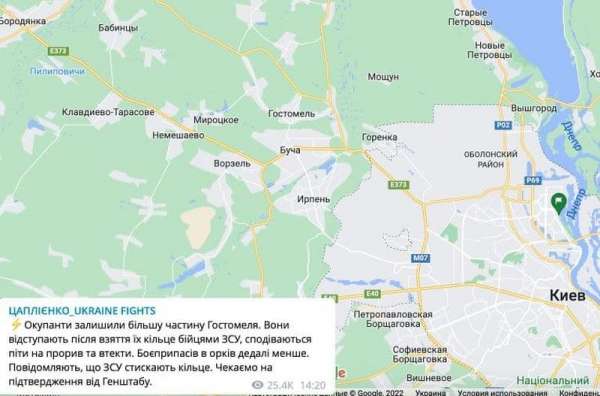 Так, к примеру, украинский журналист Андрей Цаплиенко сообщил, что под Киевом ВСУшники взяли российскую армию в «котёл»: войска РФ отрезаны возле Бучи, Ирпеня и Гостомеля, «оккупанты» покинули большую часть Гостомеля и отступают, надеясь пойти на прорыв и скрыться. К тому же, Цаплиенко почему-то уверен, что «боеприпасов у орков всё меньше».