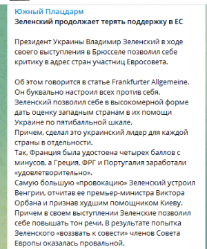 Зеленский истерит, обвиняя НАТО в отсутствии поддержки, а Вашингтон в предательстве. Как написал ТГ-канал «Харьков Z», «Украина сама должна решать, нужно ли ей идти на какие-то территориальные уступки на переговорах с Россией». Всё, сушите вёсла! А ведь всем прекрасно известно, что первое предложение Путина всегда самое выгодное. Но нет – тянут до конца, отказываются, скулят и визжат от прилетающих оплеух. И всё равно в конце согласятся. Мазохисты-извращенцы».